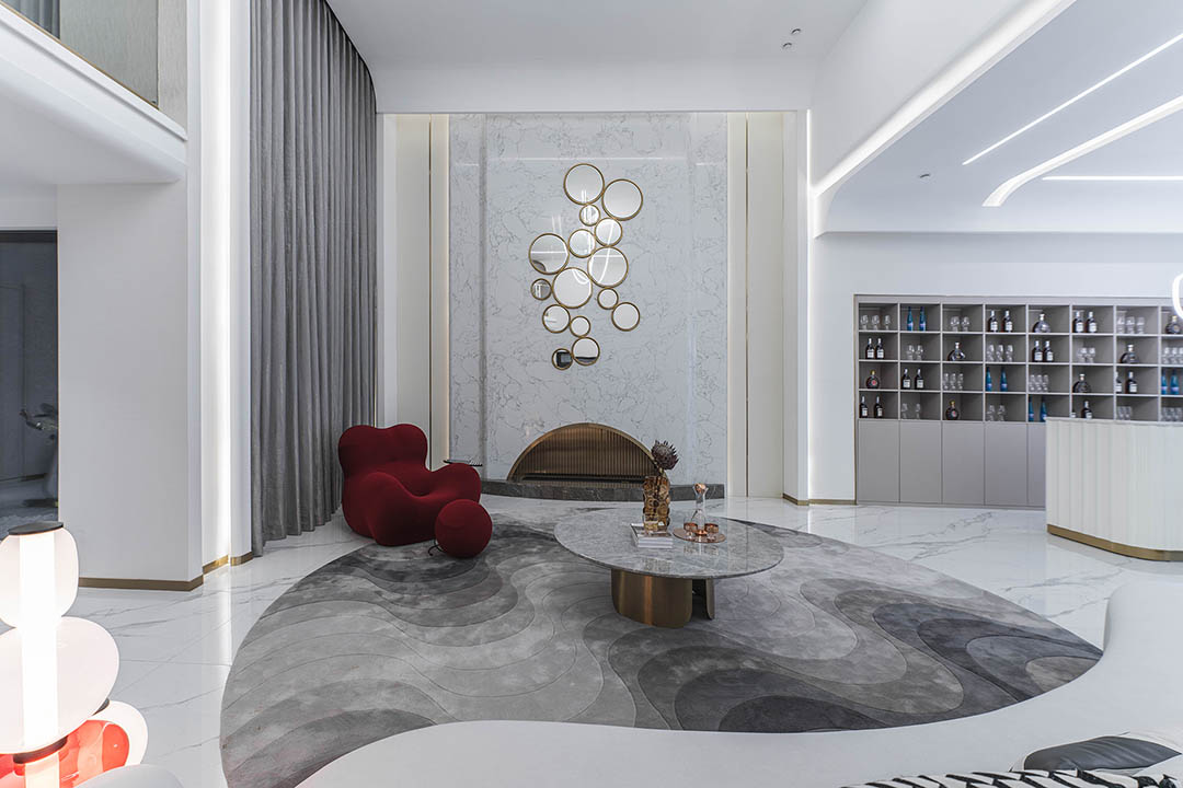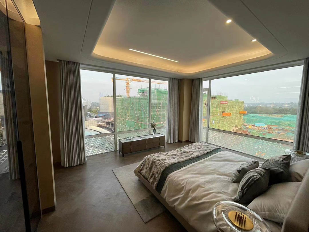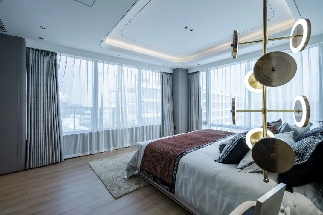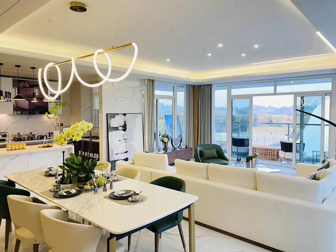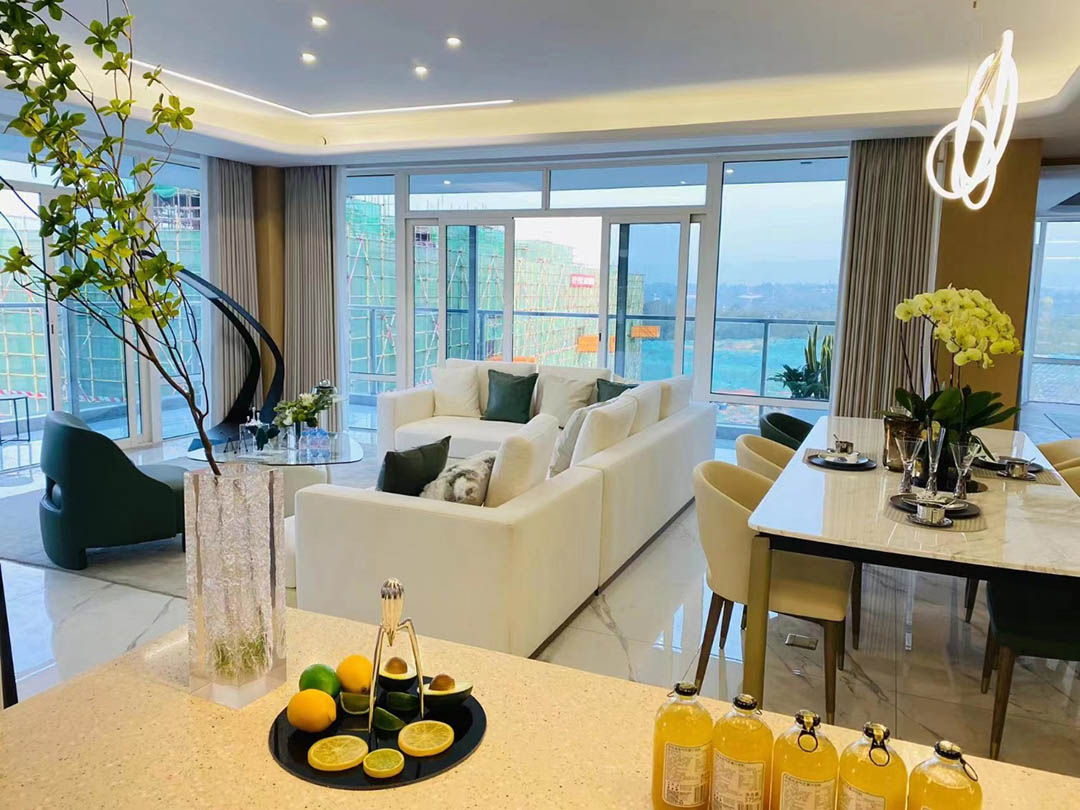 融合山水人城,犹如生长在公园里。整体占地约320亩,容积率仅约1.8。设计顺应原生丘陵地貌布局全端景墅大平层、臻钻岛院墅以及创世游艇豪宅,以大面积的玻璃幕墙设计,营造约50%窗地比,呈现超脱于市场的阔绰尺度,给予巨幅湖居的朗阔视野。