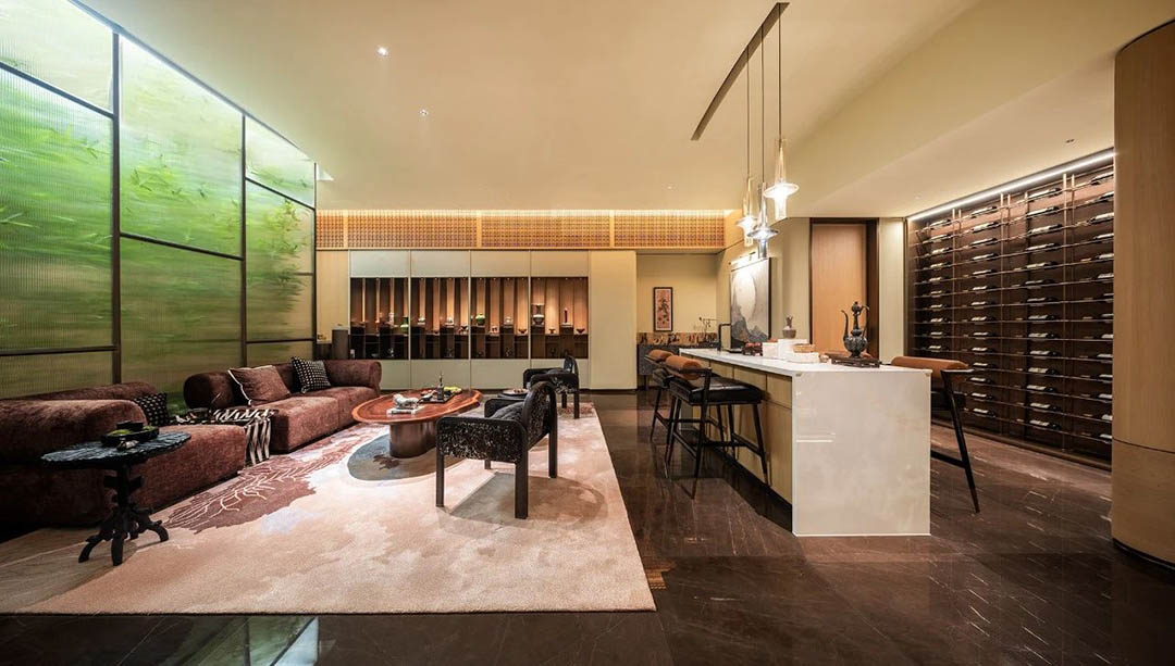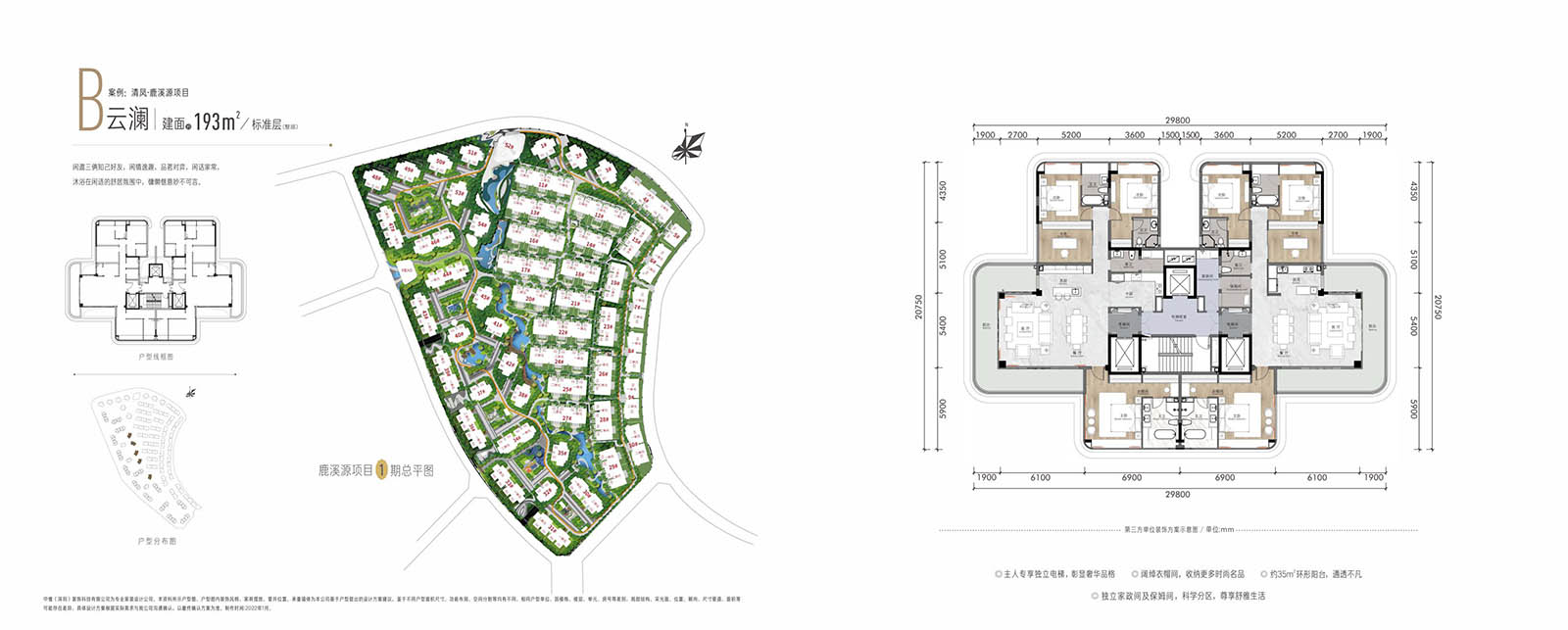 为了给塔尖人士打造出住假生活体验,借助地块整体地势高差,打造了峡谷式的园林和层峦叠翠的绿植布景,内部大致可分为东、西两部分,其中东侧为墅区,西侧为3梯2户的小高层楼栋,约35㎡U形露台,厚载生活雅趣、270°环幕观景视野,视野无界。