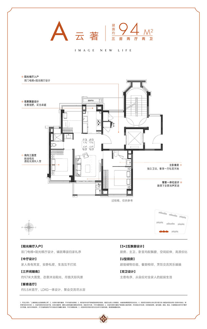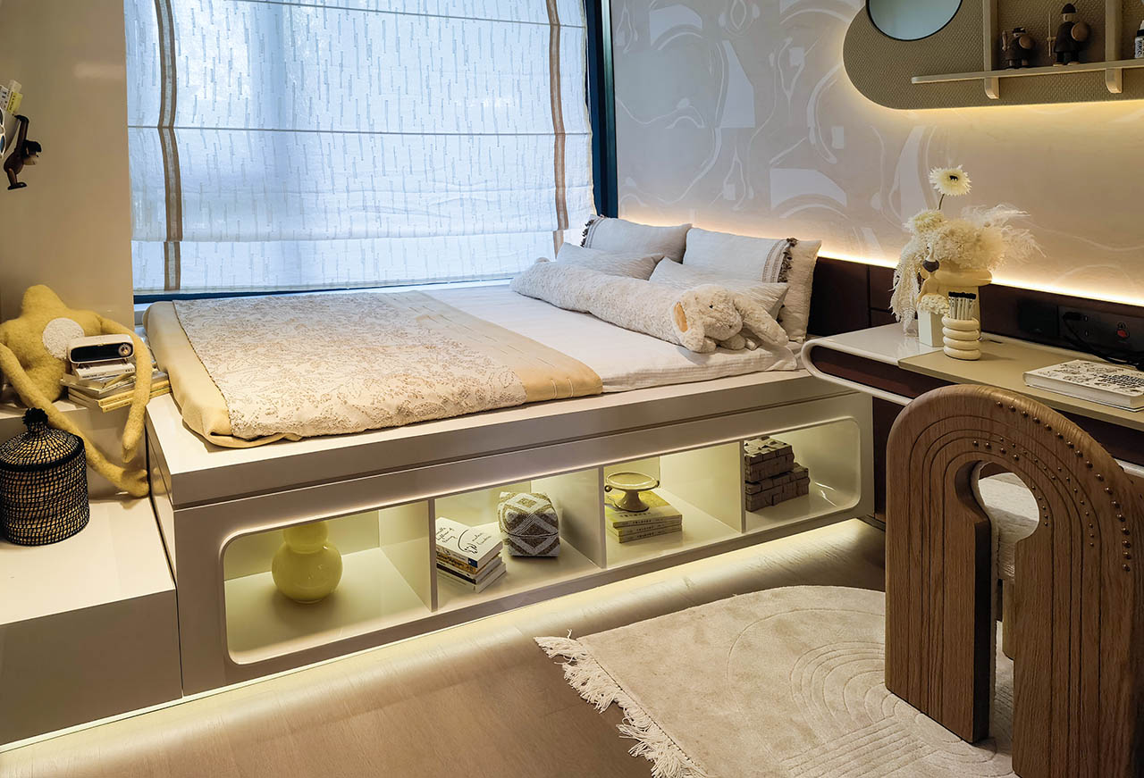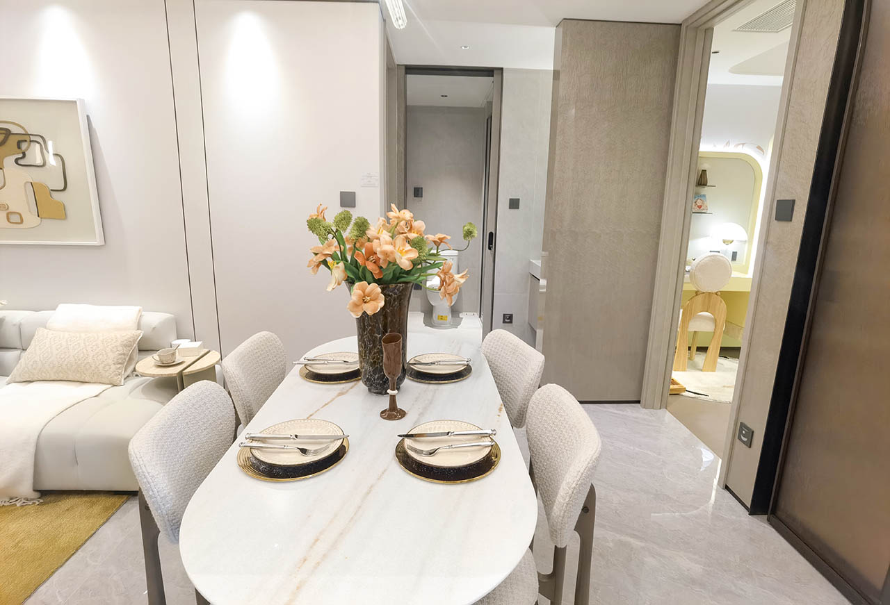 户型设计格外出众,在精控面积的同时,通过优秀的格局设计,让空间效率大大提升,具有代表性的就是,充分利用了双开门电梯+阳光梯厅的优势,打造独立外玄关空间,兼得归家仪式感和实用价值。