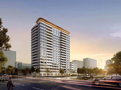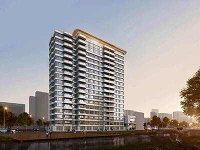 采用现代建筑风格,邀请知名团队设计,建筑布局随河蜿蜒,高低错落的建筑形态也契合了江南水乡的水韵特色,加之建筑顶部的金冠起伏,与景观河交相辉映,串联成金色丝带东西贯通,更是凸显了本项目的高标准、高品质的居住体验。