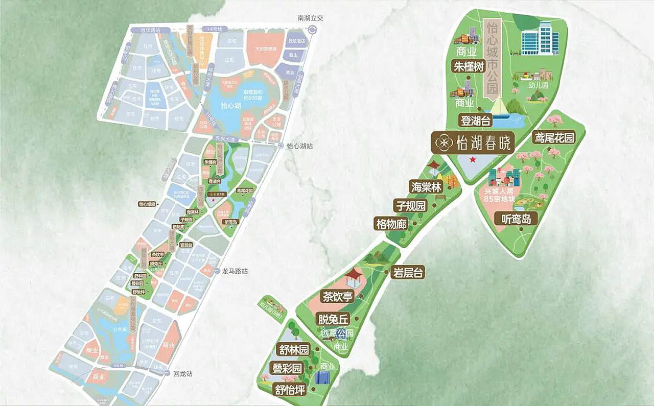 通过约1100亩公园连通怡心湖,绘制公园湖居生活的美好景致。