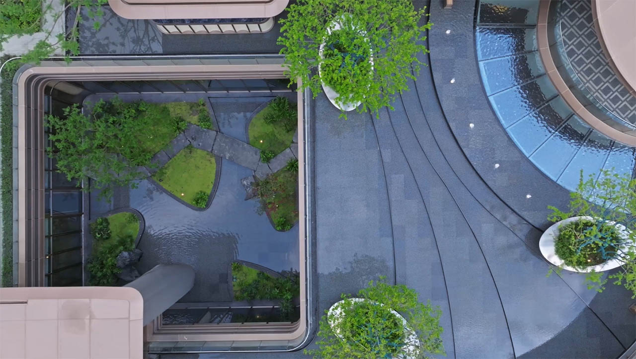 舒朗的布局,不仅让部分户型可直接眺望怡心湖主湖景,为使用全景舱提供了足够的视野支持;更让楼栋间形成两个约2000㎡以上的中庭空间,为景观系统和架空层提供资源基础。