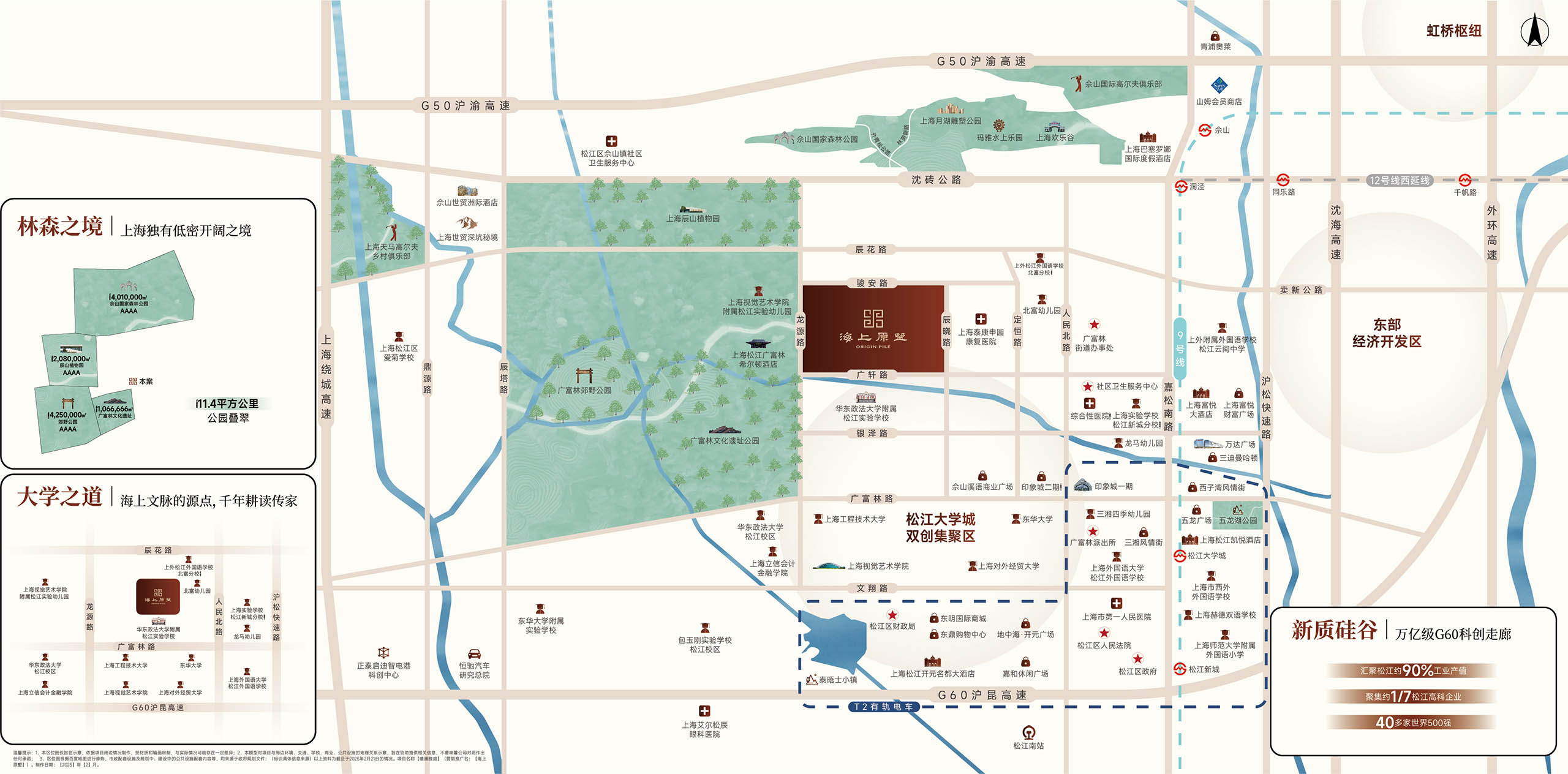 择址松江生态资源之地,周边环伺广富林文化遗址、广富林郊野公园、辰山植物园、佘山国家森林公园、月湖雕塑公园等五大生态绿肺,负氧离子充沛,自然环境优渥。居于此,推窗见绿,移步异景,尽享都市谧境,回归自然本真。